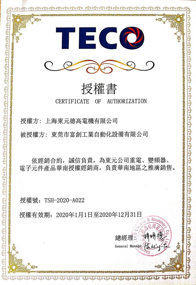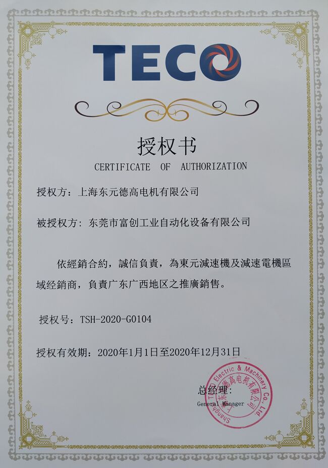 以下為東元電機(jī),東元變頻器,東元伺服電機(jī),東元低壓電器,東元齒輪減速電機(jī)代理證書!